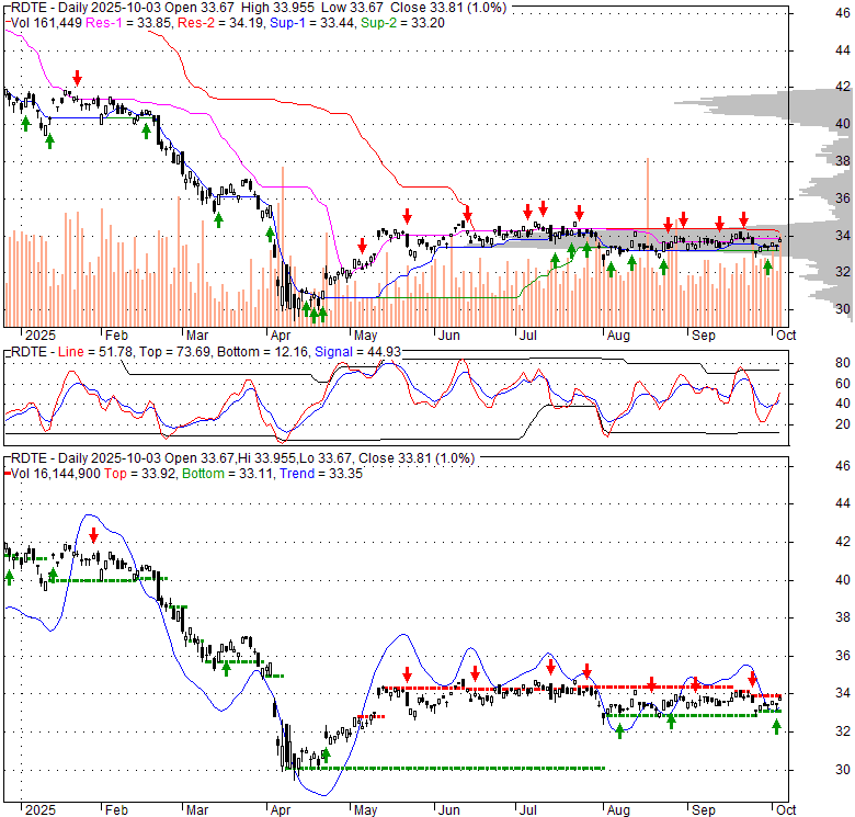 Price has closed above its short-term moving average. Short-term moving average is currently above mid-term; and below long-term moving average. From the relationship between price and moving averages: This stock is BULLISH in short-term; and NEUTRAL in mid-long term.[ RDTE ] has closed below upper band by 30.8%. Bollinger Bands are 35.3% narrower than normal. The current width of the bands does not suggest anything about the future direction or movement of prices.