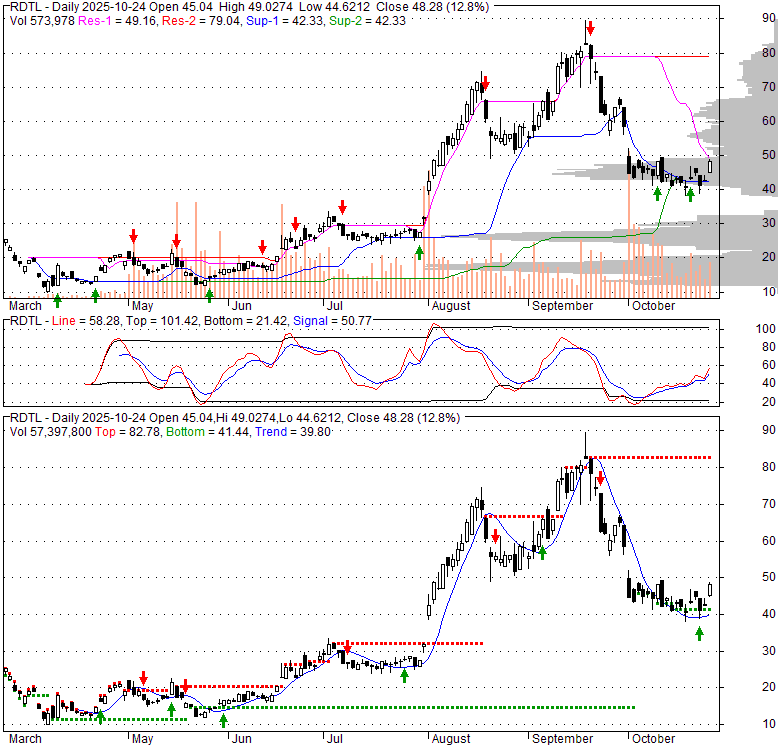 Price has closed above its short-term moving average. Short-term moving average is currently below mid-term; and below long-term moving average. From the relationship between price and moving averages: This stock is NEUTRAL in short-term; and NEUTRAL in mid-long term.[ RDTL ] has closed below upper band by 1.6%. Bollinger Bands are 61.4% narrower than normal. The narrow width of the bands suggests low volatility as compared to its normal range. The bands have been in this narrow range for 3 bars. This is a sign that the market may be about to initiate a new trend.