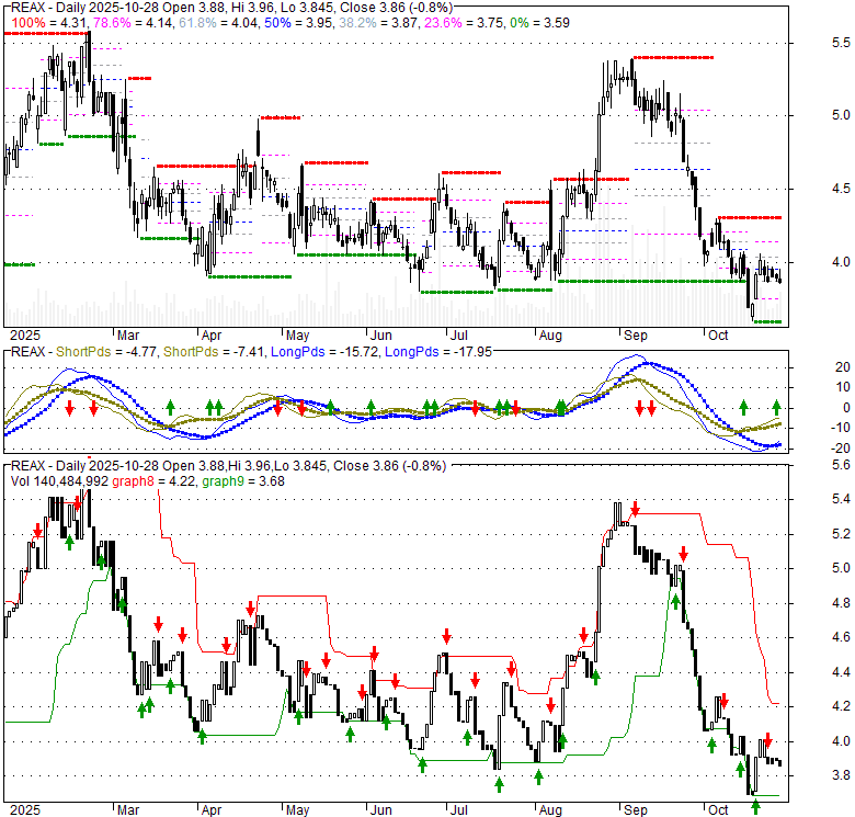 Price has closed below its short-term moving average. Short-term moving average is currently below mid-term; and below long-term moving average. From the relationship between price and moving averages: This stock is BEARISH in short-term; and NEUTRAL in mid-long term.[ REAX ] has closed above bottom band by 42.9%. Bollinger Bands are 43.5% narrower than normal. The narrow width of the bands suggests low volatility as compared to its normal range. The bands have been in this narrow range for 0 bars. This is a sign that the market may be about to initiate a new trend.