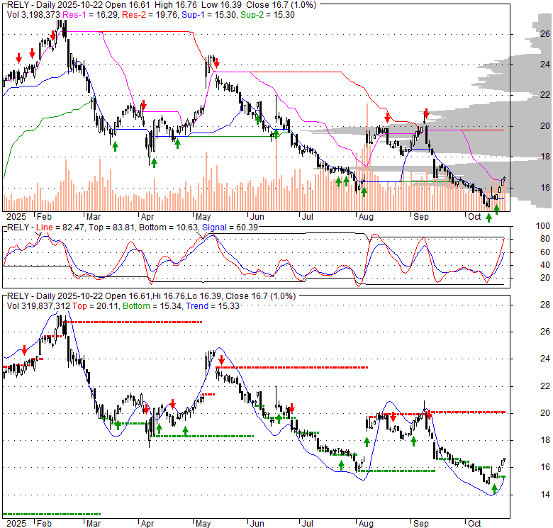 Price has closed above its short-term moving average. Short-term moving average is currently below mid-term; and below long-term moving average. From the relationship between price and moving averages: This stock is NEUTRAL in short-term; and BEARISH in mid-long term.[ RELY ] has closed below upper band by 1.4%. Bollinger Bands are 32.9% narrower than normal. The current width of the bands does not suggest anything about the future direction or movement of prices.