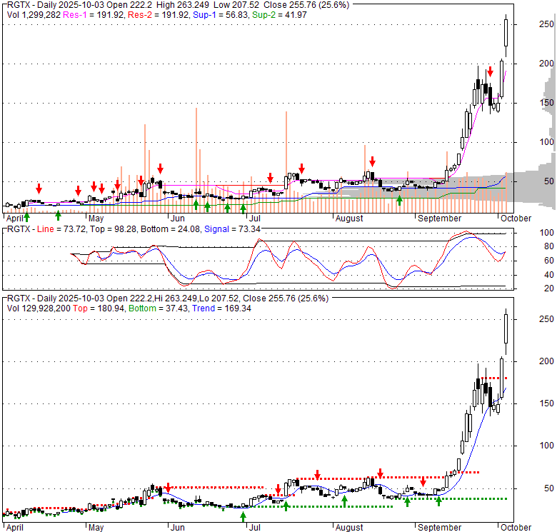 Price has closed above its short-term moving average. Short-term moving average is currently above mid-term; and above long-term moving average. From the relationship between price and moving averages: This stock is BULLISH in short-term; and BULLISH in mid-long term.[ RGTX ] has closed above the upper band by 7.4%. If price is in a uptrend band; this upward trend in price might continue. However a short term pullback inside the band is likely.Bollinger Bands are 373.4% wider than normal. The large width of the bands suggest high volatility as compared to its normal range. The bands have been in this wide range for {EMPTY} days. This is a sign that the current trend might continue.