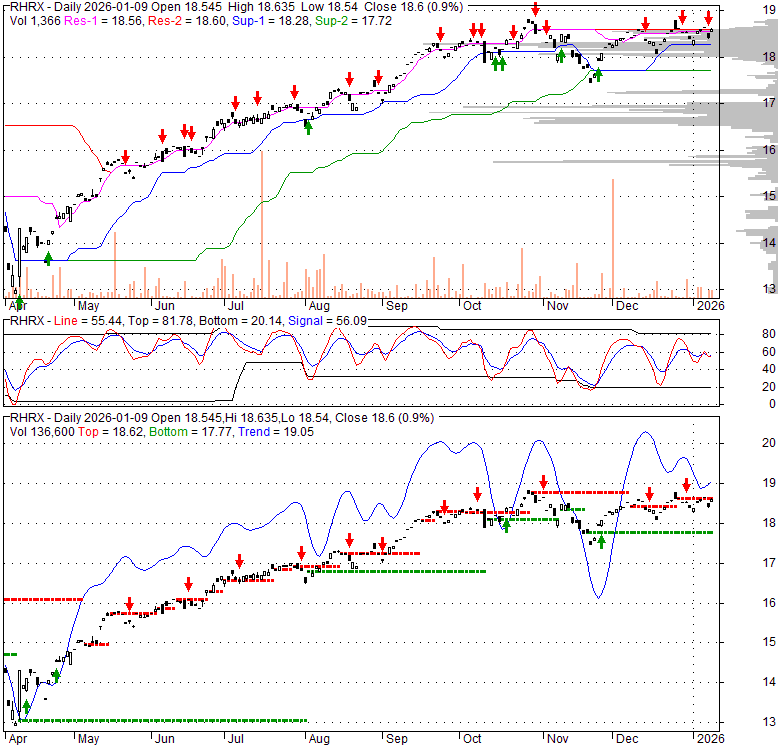 Price has closed above its short-term moving average. Short-term moving average is currently above mid-term; and above long-term moving average. From the relationship between price and moving averages: This stock is BULLISH in short-term; and BULLISH in mid-long term.[ RHRX ] has closed below upper band by 28.5%. Bollinger Bands are 46% narrower than normal. The narrow width of the bands suggests low volatility as compared to its normal range. The bands have been in this narrow range for 0 bars. This is a sign that the market may be about to initiate a new trend.