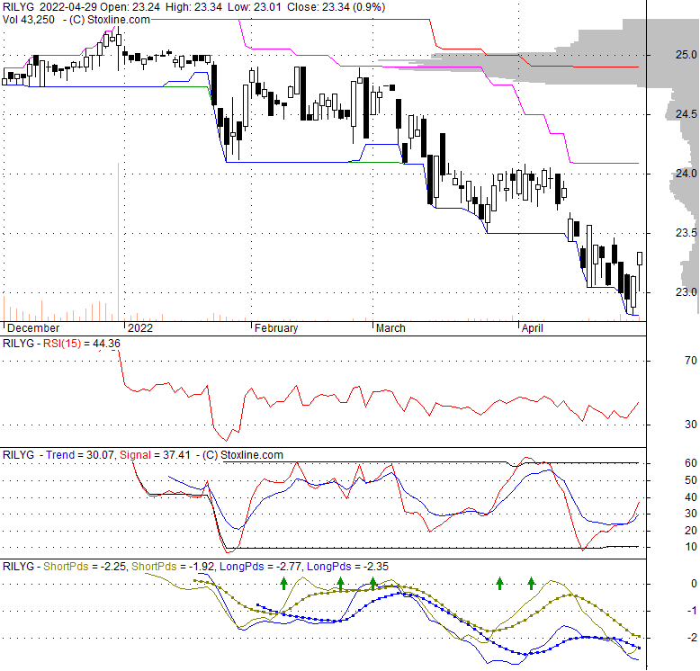 Price has closed above its short-term moving average. Short-term moving average is currently below mid-term; and below long-term moving average. From the relationship between price and moving averages: This stock is NEUTRAL in short-term; and BEARISH in mid-long term.[ RILYG ] has closed above bottom band by 45.4%. Bollinger Bands are 0% narrower than normal.