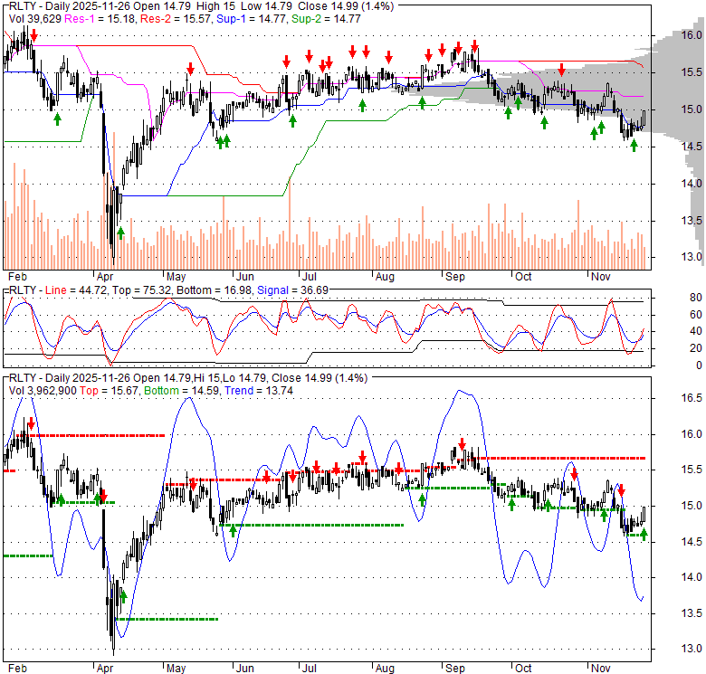 Price has closed above its short-term moving average. Short-term moving average is currently below mid-term; and below long-term moving average. From the relationship between price and moving averages: This stock is NEUTRAL in short-term; and BEARISH in mid-long term.[ RLTY ] has closed below upper band by 42.0%. Bollinger Bands are 78.7% wider than normal. The large width of the bands suggest high volatility as compared to its normal range. The bands have been in this wide range for 5 days. This is a sign that the current trend might continue.