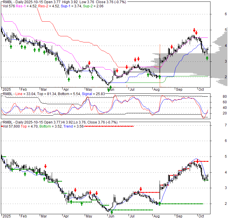 Price has closed above its short-term moving average. Short-term moving average is currently below mid-term; and above long-term moving average. From the relationship between price and moving averages: This stock is NEUTRAL in short-term; and NEUTRAL in mid-long term.[ RMBL ] has closed above bottom band by 35.0%. Bollinger Bands are 52.4% wider than normal. The large width of the bands suggest high volatility as compared to its normal range. The bands have been in this wide range for 3 days. This is a sign that the current trend might continue.