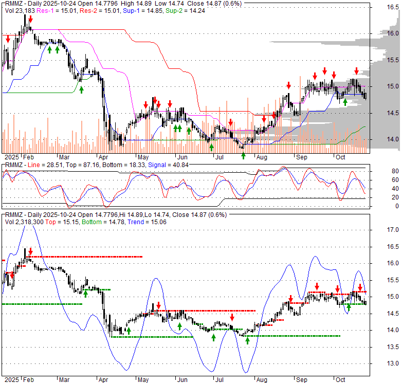 Price has closed below its short-term moving average. Short-term moving average is currently above mid-term; and above long-term moving average. From the relationship between price and moving averages: This stock is NEUTRAL in short-term; and BULLISH in mid-long term.[ RMMZ ] has closed above bottom band by 35.1%. Bollinger Bands are 16% narrower than normal. The current width of the bands does not suggest anything about the future direction or movement of prices.