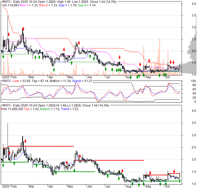 Price has closed above its short-term moving average. Short-term moving average is currently above mid-term; and below long-term moving average. From the relationship between price and moving averages: This stock is BULLISH in short-term; and NEUTRAL in mid-long term.[ RNTX ] has closed below upper band by 5.3%. Bollinger Bands are 17.5% narrower than normal. The current width of the bands does not suggest anything about the future direction or movement of prices.