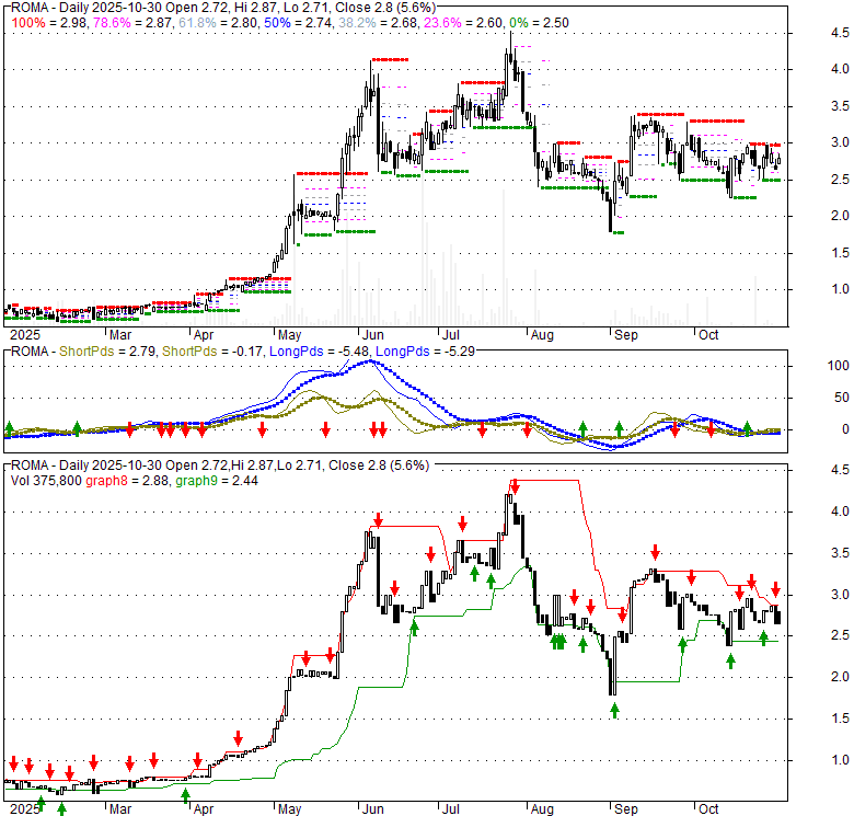 Price has closed above its short-term moving average. Short-term moving average is currently below mid-term; and below long-term moving average. From the relationship between price and moving averages: This stock is NEUTRAL in short-term; and BEARISH in mid-long term.[ ROMA ] has closed below upper band by 40.5%. Bollinger Bands are 51% narrower than normal. The narrow width of the bands suggests low volatility as compared to its normal range. The bands have been in this narrow range for 19 bars. This is a sign that the market may be about to initiate a new trend.