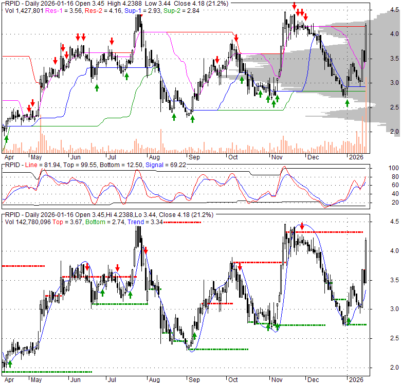 Price has closed above its short-term moving average. Short-term moving average is currently below mid-term; and above long-term moving average. From the relationship between price and moving averages: This stock is NEUTRAL in short-term; and NEUTRAL in mid-long term.[ RPID ] has closed Bollinger Bands are 33.8% wider than normal. The current width of the bands does not suggest anything about the future direction or movement of prices.