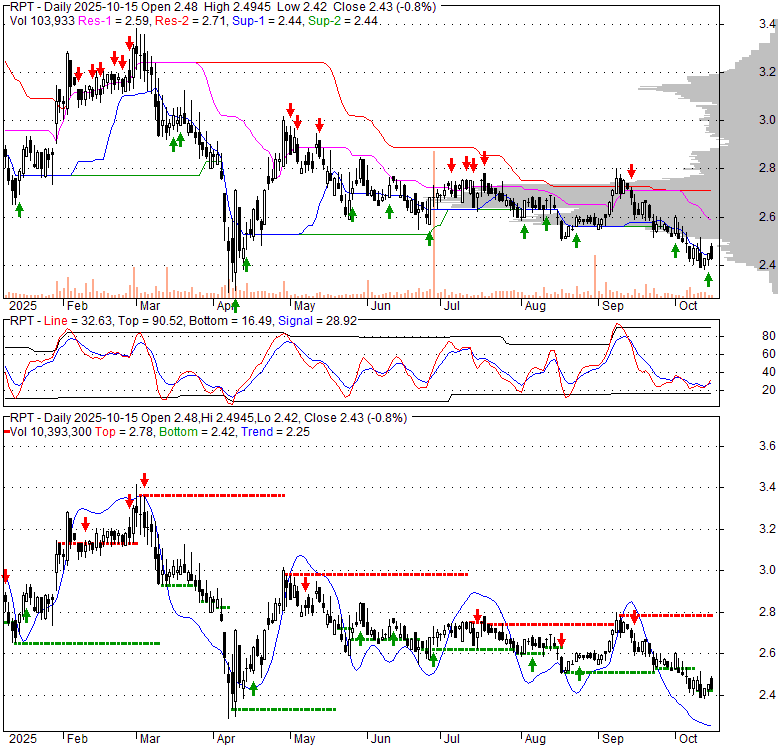 Price has closed above its short-term moving average. Short-term moving average is currently below mid-term; and below long-term moving average. From the relationship between price and moving averages: This stock is NEUTRAL in short-term; and BEARISH in mid-long term.[ RPT ] has closed above bottom band by 43.7%. Bollinger Bands are 14% wider than normal. The current width of the bands does not suggest anything about the future direction or movement of prices.