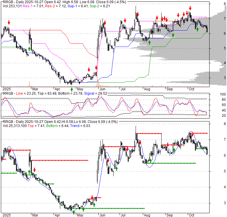 Price has closed below its short-term moving average. Short-term moving average is currently below mid-term; and below long-term moving average. From the relationship between price and moving averages: This stock is BEARISH in short-term; and NEUTRAL in mid-long term.[ RRGB ] has closed below the lower bollinger band by 6.2%. If price is in a downtrend band; this downward trend might continue. However a short term pullback inside the band is likely. Bollinger Bands are 43.1% narrower than normal. The narrow width of the bands suggests low volatility as compared to its normal range. The bands have been in this narrow range for 21 bars. This is a sign that the market may be about to initiate a new trend.