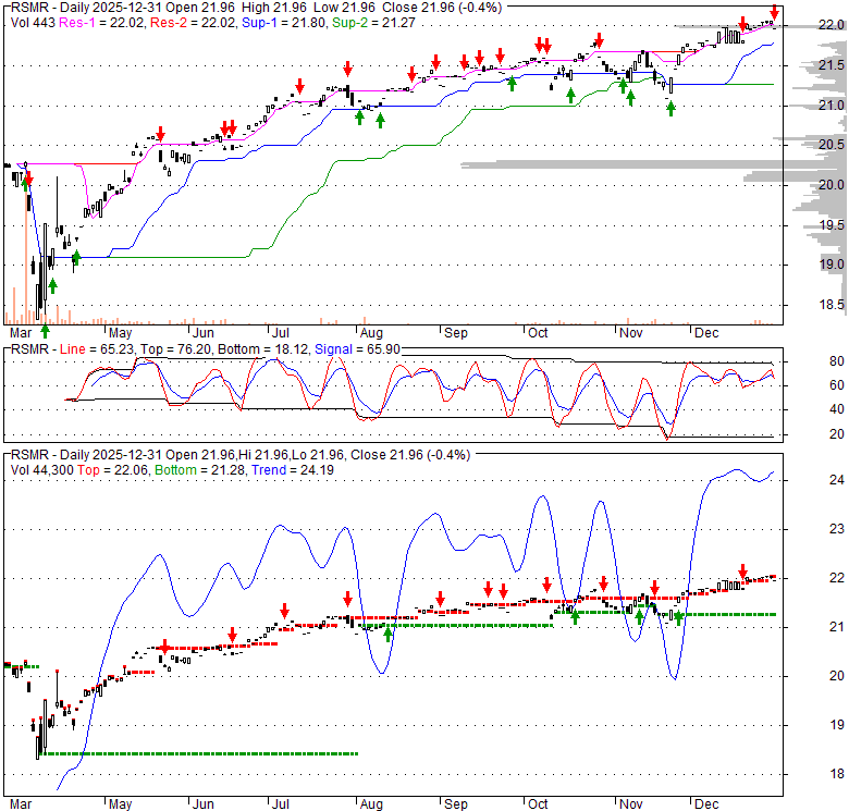 Price has closed below its short-term moving average. Short-term moving average is currently above mid-term; and above long-term moving average. From the relationship between price and moving averages: This stock is NEUTRAL in short-term; and BULLISH in mid-long term.[ RSMR ] has closed above bottom band by 46.3%. Bollinger Bands are 45.8% narrower than normal. The narrow width of the bands suggests low volatility as compared to its normal range. The bands have been in this narrow range for 0 bars. This is a sign that the market may be about to initiate a new trend.
