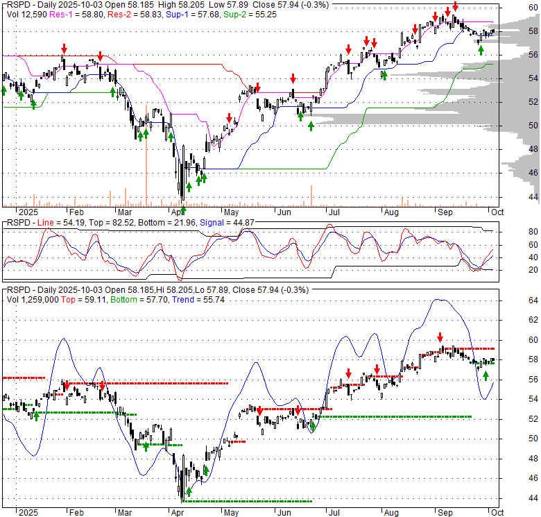 Price has closed below its short-term moving average. Short-term moving average is currently above mid-term; and above long-term moving average. From the relationship between price and moving averages: This stock is NEUTRAL in short-term; and BULLISH in mid-long term.[ RSPD ] has closed above bottom band by 46.1%. Bollinger Bands are 53.6% narrower than normal. The narrow width of the bands suggests low volatility as compared to its normal range. The bands have been in this narrow range for 1 bars. This is a sign that the market may be about to initiate a new trend.