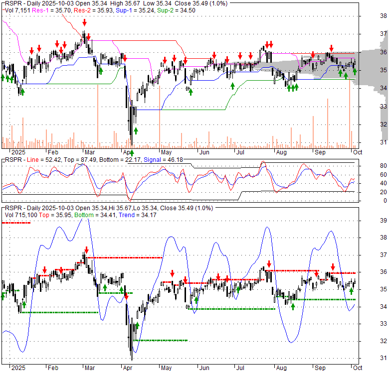 Price has closed above its short-term moving average. Short-term moving average is currently above mid-term; and above long-term moving average. From the relationship between price and moving averages: This stock is BULLISH in short-term; and BULLISH in mid-long term.[ RSPR ] has closed below upper band by 35.4%. Bollinger Bands are 47.6% narrower than normal. The narrow width of the bands suggests low volatility as compared to its normal range. The bands have been in this narrow range for 0 bars. This is a sign that the market may be about to initiate a new trend.