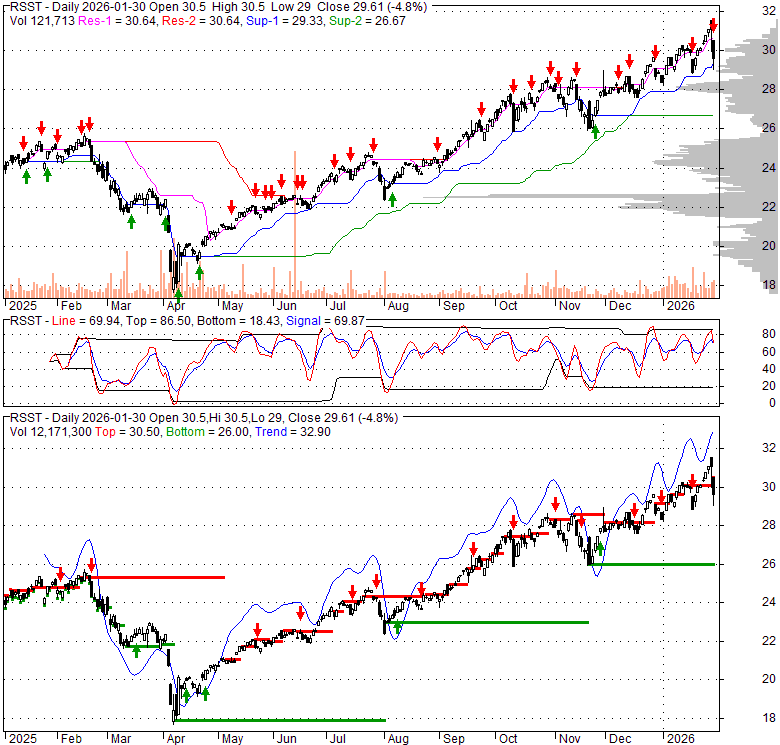 Price has closed below its short-term moving average. Short-term moving average is currently above mid-term; and above long-term moving average. From the relationship between price and moving averages: This stock is NEUTRAL in short-term; and BULLISH in mid-long term.[ RSST ] has closed above bottom band by 28.0%. Bollinger Bands are 6.5% wider than normal. The current width of the bands does not suggest anything about the future direction or movement of prices.