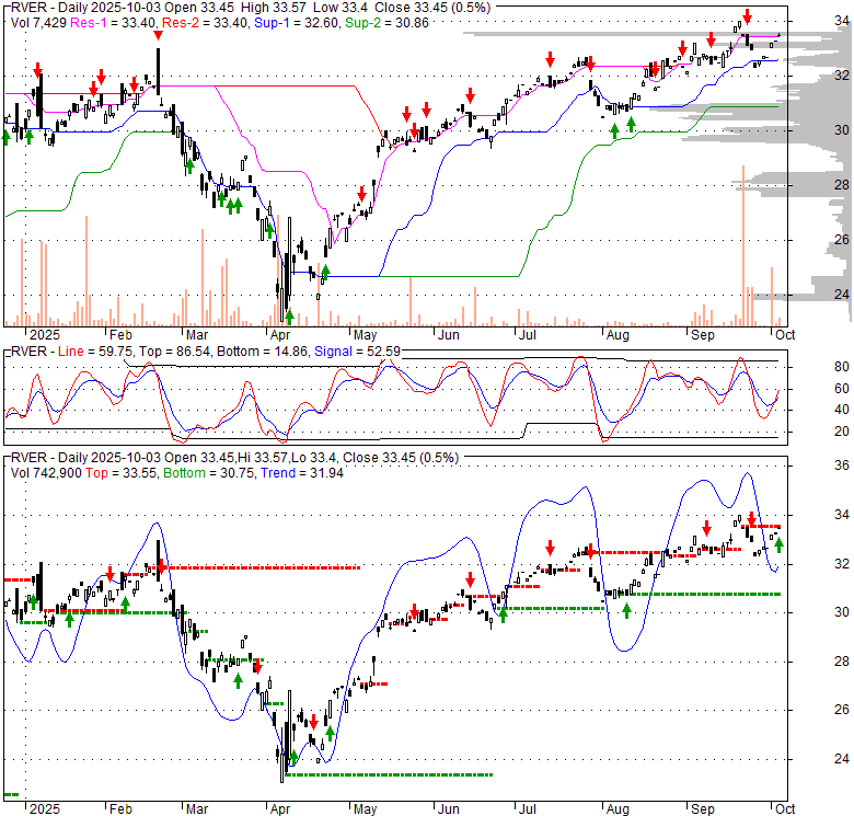 Price has closed above its short-term moving average. Short-term moving average is currently above mid-term; and above long-term moving average. From the relationship between price and moving averages: This stock is BULLISH in short-term; and BULLISH in mid-long term.[ RVER ] has closed below upper band by 28.5%. Bollinger Bands are 15.3% narrower than normal. The current width of the bands does not suggest anything about the future direction or movement of prices.