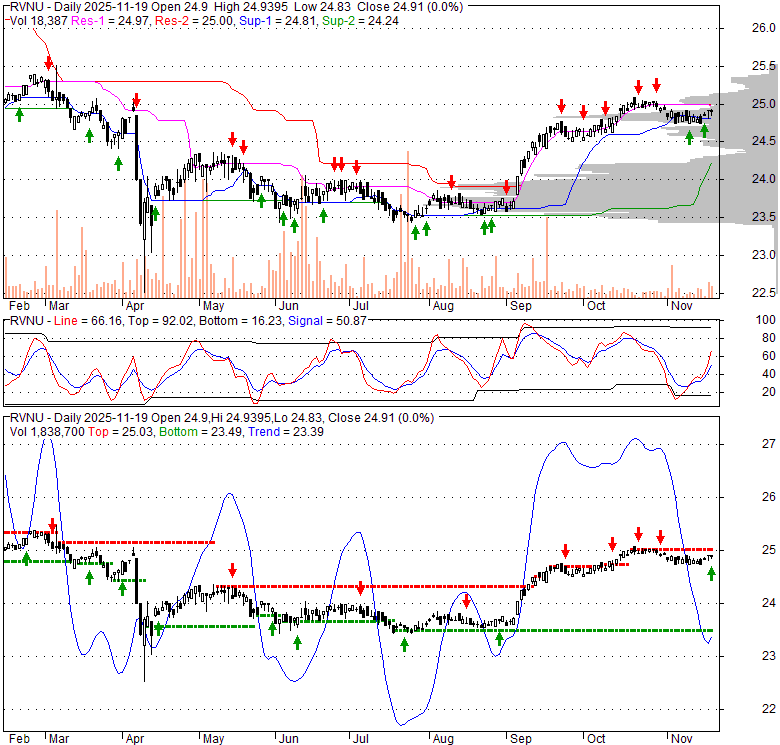Price has closed above its short-term moving average. Short-term moving average is currently above mid-term; and above long-term moving average. From the relationship between price and moving averages: This stock is BULLISH in short-term; and BULLISH in mid-long term.[ RVNU ] has closed below upper band by 23.2%. Bollinger Bands are 48.5% narrower than normal. The narrow width of the bands suggests low volatility as compared to its normal range. The bands have been in this narrow range for 1 bars. This is a sign that the market may be about to initiate a new trend.