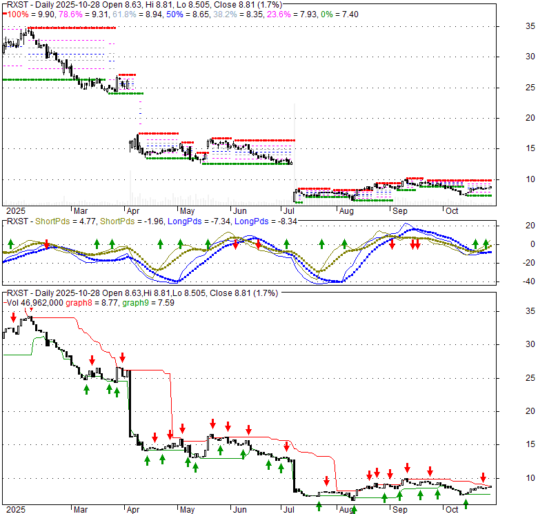 Price has closed above its short-term moving average. Short-term moving average is currently below mid-term; and below long-term moving average. From the relationship between price and moving averages: This stock is NEUTRAL in short-term; and BEARISH in mid-long term.[ RXST ] has closed below upper band by 16.7%. Bollinger Bands are 42.1% narrower than normal. The narrow width of the bands suggests low volatility as compared to its normal range. The bands have been in this narrow range for 5 bars. This is a sign that the market may be about to initiate a new trend.