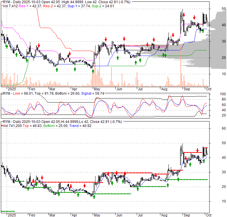 Price has closed below its short-term moving average. Short-term moving average is currently above mid-term; and above long-term moving average. From the relationship between price and moving averages: This stock is NEUTRAL in short-term; and BULLISH in mid-long term.[ RYM ] has closed below upper band by 25.9%. Bollinger Bands are 3% narrower than normal. The current width of the bands does not suggest anything about the future direction or movement of prices.