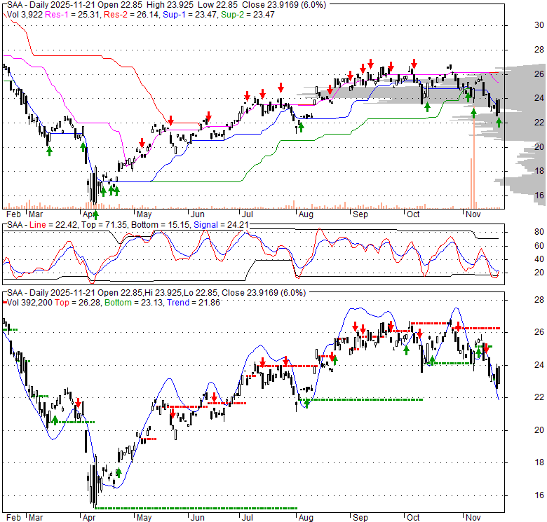 Price has closed above its short-term moving average. Short-term moving average is currently below mid-term; and below long-term moving average. From the relationship between price and moving averages: This stock is NEUTRAL in short-term; and NEUTRAL in mid-long term.[ SAA ] has closed above bottom band by 39.1%. Bollinger Bands are 44.8% wider than normal. The large width of the bands suggest high volatility as compared to its normal range. The bands have been in this wide range for 1 days. This is a sign that the current trend might continue.