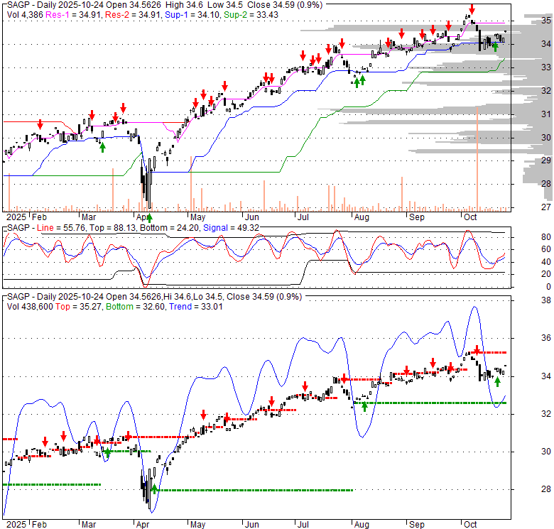 Price has closed above its short-term moving average. Short-term moving average is currently above mid-term; and above long-term moving average. From the relationship between price and moving averages: This stock is BULLISH in short-term; and BULLISH in mid-long term.[ SAGP ] has closed below upper band by 35.3%. Bollinger Bands are 19.2% wider than normal. The current width of the bands does not suggest anything about the future direction or movement of prices.