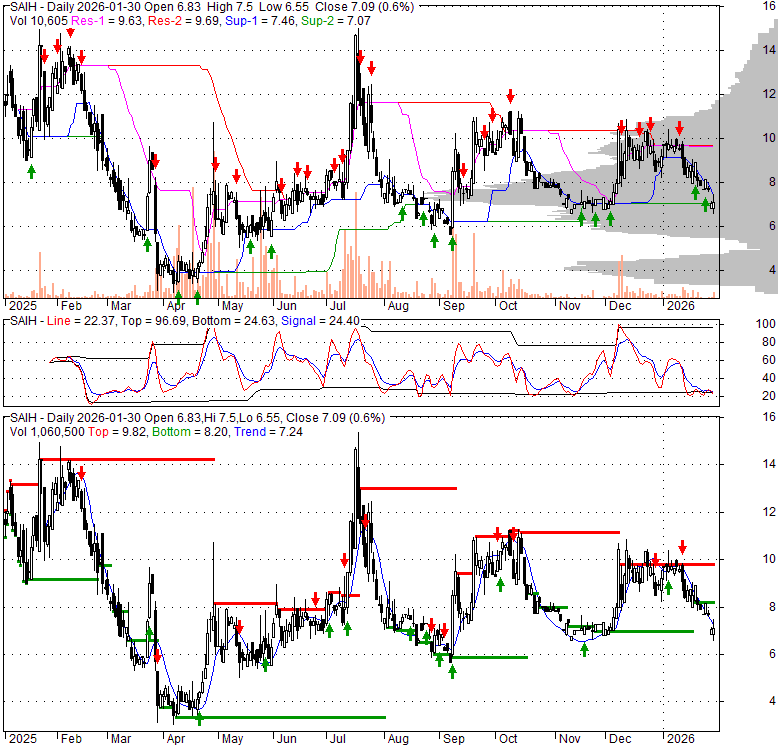 Price has closed below its short-term moving average. Short-term moving average is currently below mid-term; and below long-term moving average. From the relationship between price and moving averages: This stock is BEARISH in short-term; and NEUTRAL in mid-long term.[ SAIH ] has closed above bottom band by 8.8%. Bollinger Bands are 7.2% wider than normal. The current width of the bands does not suggest anything about the future direction or movement of prices.