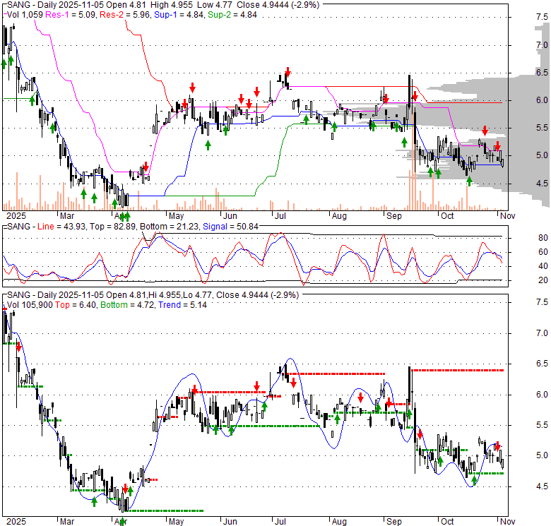 Price has closed below its short-term moving average. Short-term moving average is currently below mid-term; and below long-term moving average. From the relationship between price and moving averages: This stock is BEARISH in short-term; and BEARISH in mid-long term.[ SANG ] has closed above bottom band by 38.3%. Bollinger Bands are 19.8% narrower than normal. The current width of the bands does not suggest anything about the future direction or movement of prices.