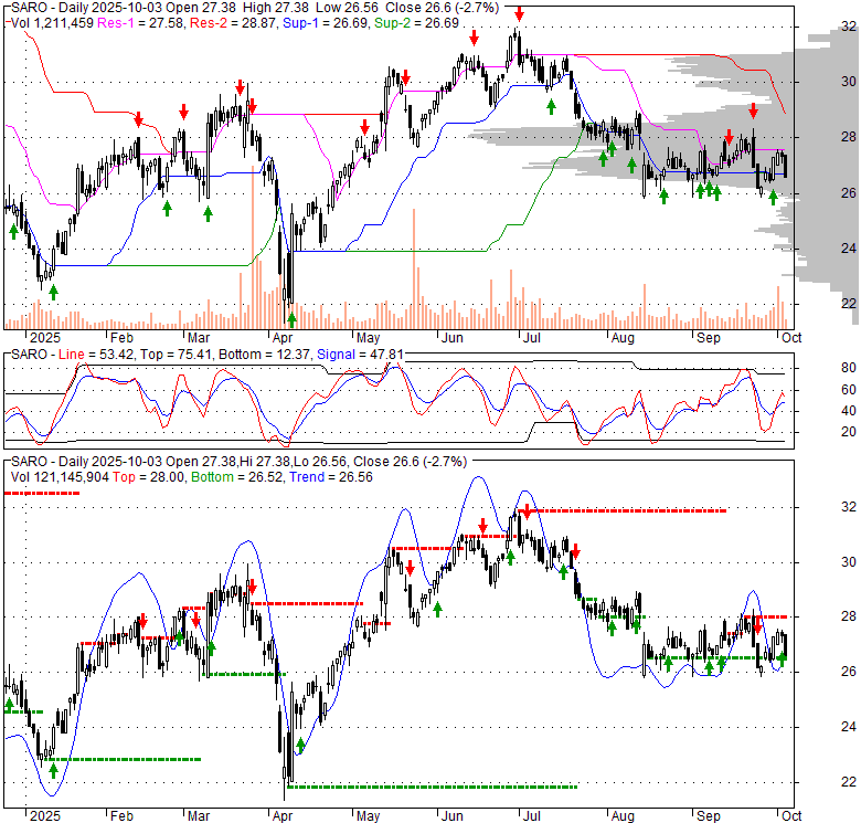 Price has closed below its short-term moving average. Short-term moving average is currently below mid-term; and below long-term moving average. From the relationship between price and moving averages: This stock is BEARISH in short-term; and BEARISH in mid-long term.[ SARO ] has closed above bottom band by 27.2%. Bollinger Bands are 18.1% narrower than normal. The current width of the bands does not suggest anything about the future direction or movement of prices.