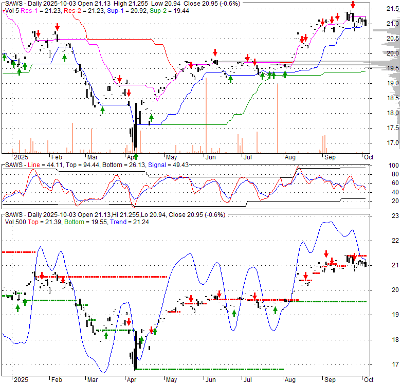 Price has closed below its short-term moving average. Short-term moving average is currently above mid-term; and above long-term moving average. From the relationship between price and moving averages: This stock is NEUTRAL in short-term; and BULLISH in mid-long term.[ SAWS ] has closed above bottom band by 28.5%. Bollinger Bands are 27.5% narrower than normal. The current width of the bands does not suggest anything about the future direction or movement of prices.