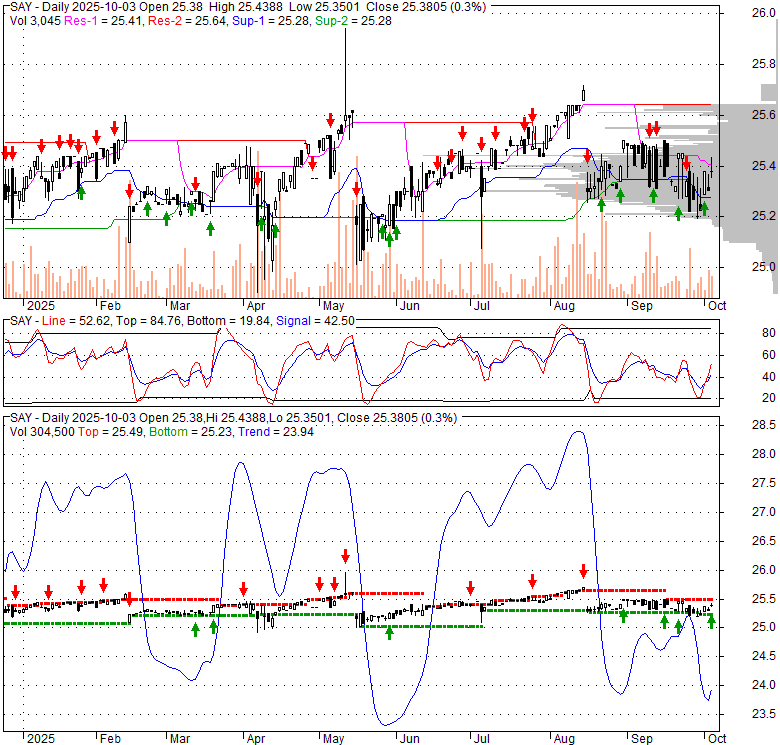 Price has closed above its short-term moving average. Short-term moving average is currently below mid-term; and below long-term moving average. From the relationship between price and moving averages: This stock is NEUTRAL in short-term; and NEUTRAL in mid-long term.[ SAY ] has closed below upper band by 35.5%. Bollinger Bands are 7.8% narrower than normal. The current width of the bands does not suggest anything about the future direction or movement of prices.