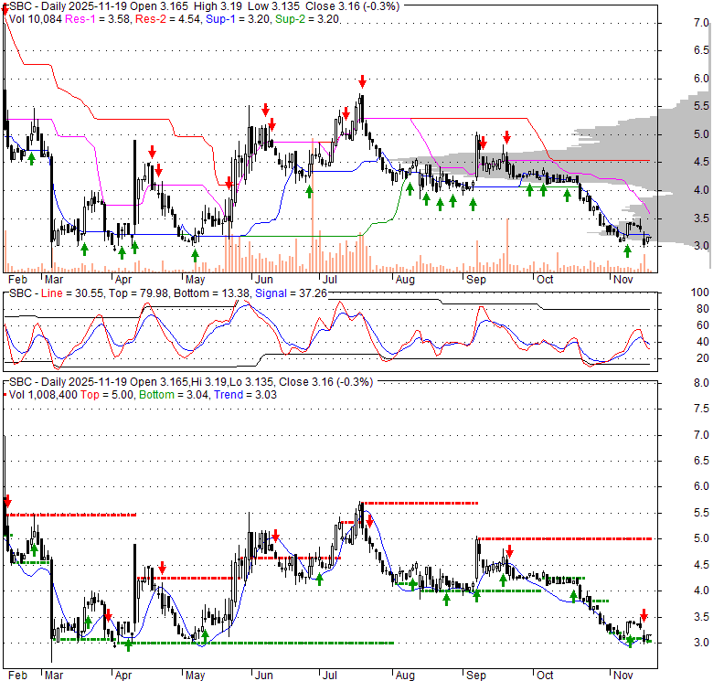 Price has closed below its short-term moving average. Short-term moving average is currently below mid-term; and below long-term moving average. From the relationship between price and moving averages: This stock is BEARISH in short-term; and BEARISH in mid-long term.[ SBC ] has closed above bottom band by 29.8%. Bollinger Bands are 46.7% narrower than normal. The narrow width of the bands suggests low volatility as compared to its normal range. The bands have been in this narrow range for 1 bars. This is a sign that the market may be about to initiate a new trend.