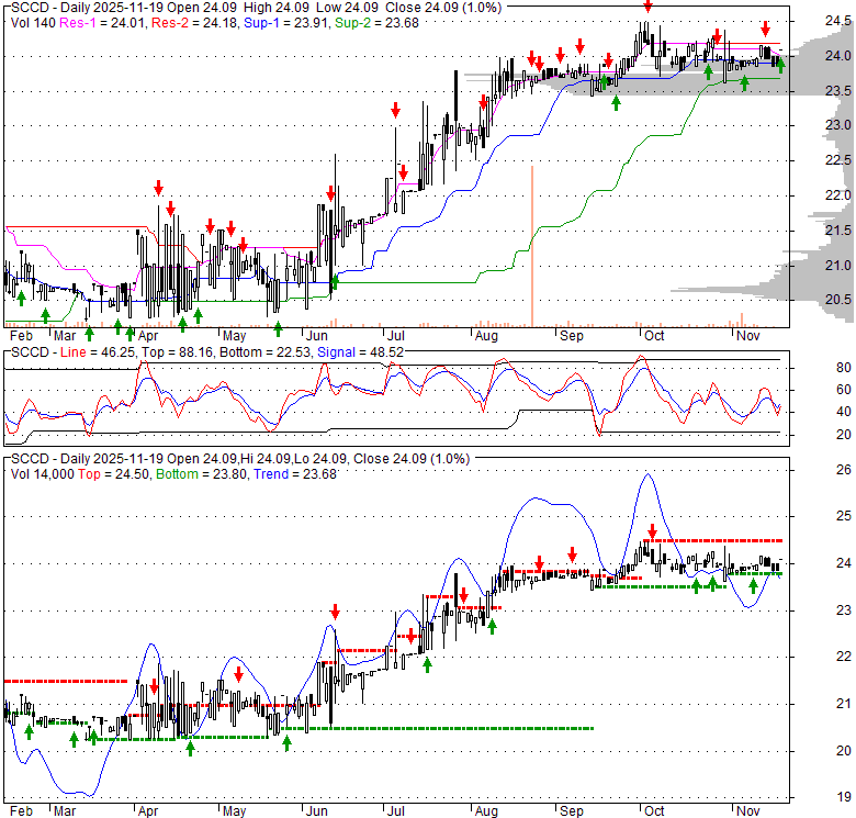 Price has closed above its short-term moving average. Short-term moving average is currently below mid-term; and above long-term moving average. From the relationship between price and moving averages: This stock is NEUTRAL in short-term; and NEUTRAL in mid-long term.[ SCCD ] has closed below upper band by 5.0%. Bollinger Bands are 55.8% narrower than normal. The narrow width of the bands suggests low volatility as compared to its normal range. The bands have been in this narrow range for 3 bars. This is a sign that the market may be about to initiate a new trend.