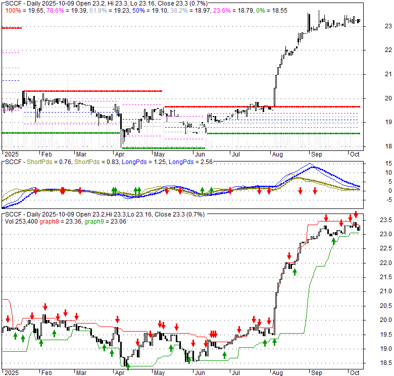 Price has closed above its short-term moving average. Short-term moving average is currently above mid-term; and above long-term moving average. From the relationship between price and moving averages: This stock is BULLISH in short-term; and BULLISH in mid-long term.[ SCCF ] has closed below upper band by 29.7%. Bollinger Bands are 56.8% narrower than normal. The narrow width of the bands suggests low volatility as compared to its normal range. The bands have been in this narrow range for 16 bars. This is a sign that the market may be about to initiate a new trend.