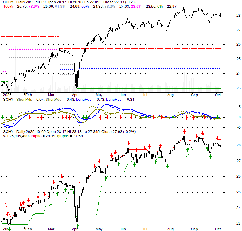 Price has closed below its short-term moving average. Short-term moving average is currently below mid-term; and above long-term moving average. From the relationship between price and moving averages: This stock is BEARISH in short-term; and NEUTRAL in mid-long term.[ SCHY ] has closed above bottom band by 44.1%. Bollinger Bands are 28.7% narrower than normal. The current width of the bands does not suggest anything about the future direction or movement of prices.