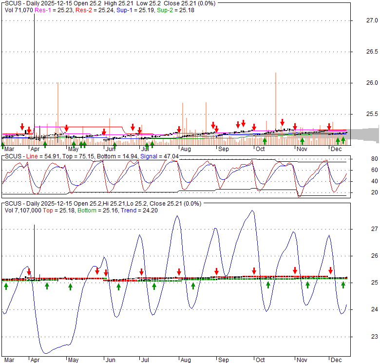 Price has closed above its short-term moving average. Short-term moving average is currently below mid-term; and above long-term moving average. From the relationship between price and moving averages: This stock is NEUTRAL in short-term; and NEUTRAL in mid-long term.[ SCUS ] has closed below upper band by 41.1%. Bollinger Bands are 10.7% wider than normal. The current width of the bands does not suggest anything about the future direction or movement of prices.