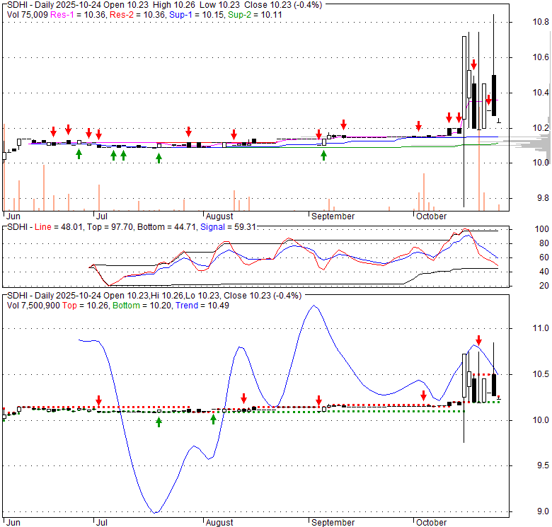 Price has closed below its short-term moving average. Short-term moving average is currently above mid-term; and below long-term moving average. From the relationship between price and moving averages: This stock is NEUTRAL in short-term; and NEUTRAL in mid-long term.[ SDHI ] has closed above bottom band by 44.0%. Bollinger Bands are 0% narrower than normal.