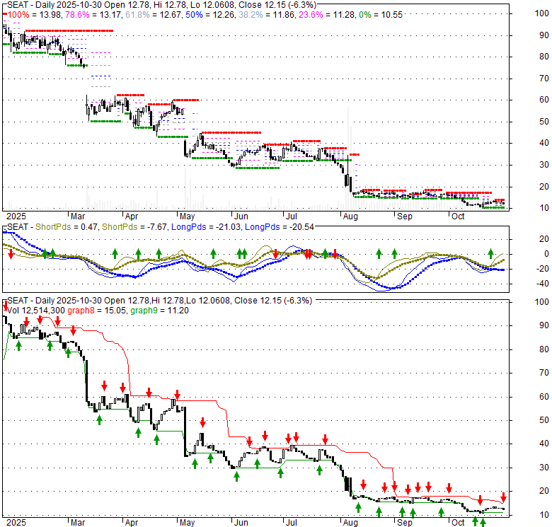 Price has closed below its short-term moving average. Short-term moving average is currently below mid-term; and below long-term moving average. From the relationship between price and moving averages: This stock is BEARISH in short-term; and BEARISH in mid-long term.[ SEAT ] has closed below upper band by 37.5%. Bollinger Bands are 67.6% narrower than normal. The narrow width of the bands suggests low volatility as compared to its normal range. The bands have been in this narrow range for 6 bars. This is a sign that the market may be about to initiate a new trend.