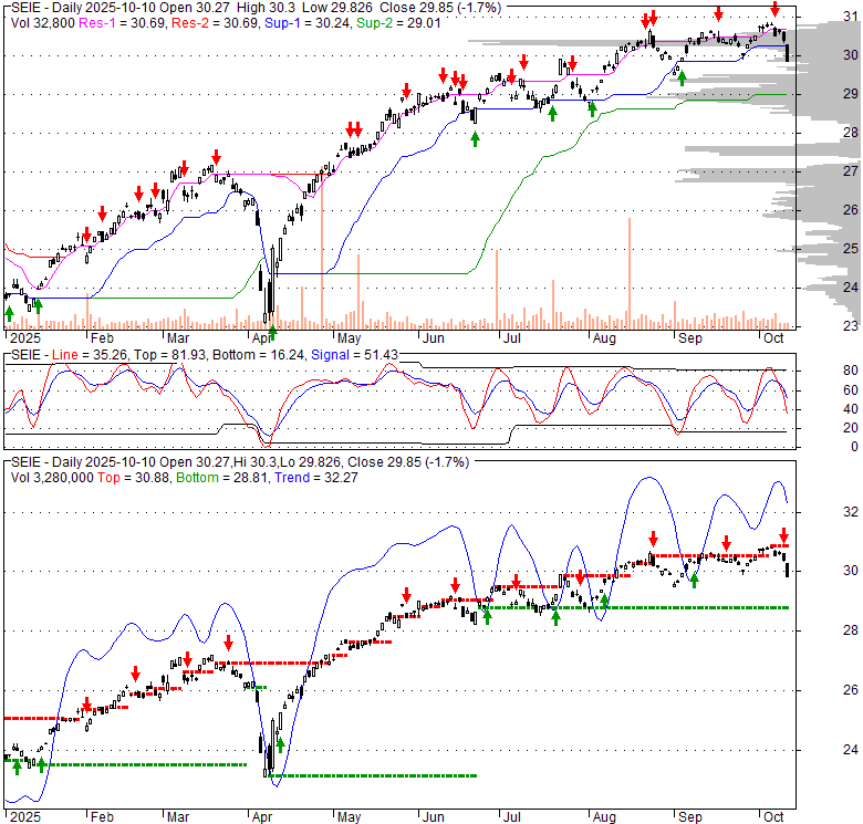Price has closed below its short-term moving average. Short-term moving average is currently above mid-term; and above long-term moving average. From the relationship between price and moving averages: This stock is NEUTRAL in short-term; and BULLISH in mid-long term.[ SEIE ] has closed below the lower bollinger band by 5.7%. If price is in a downtrend band; this downward trend might continue. However a short term pullback inside the band is likely. Bollinger Bands are 12.8% narrower than normal. The current width of the bands does not suggest anything about the future direction or movement of prices.