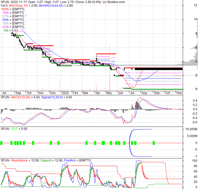Price has closed below its short-term moving average. Short-term moving average is currently below mid-term; and above long-term moving average. From the relationship between price and moving averages: This stock is NEUTRAL in short-term; and NEUTRAL in mid-long term.[ SFUN ] has closed Bollinger Bands are 100% narrower than normal. The narrow width of the bands suggests low volatility as compared to its normal range. The bands have been in this narrow range for 73 bars. This is a sign that the market may be about to initiate a new trend.