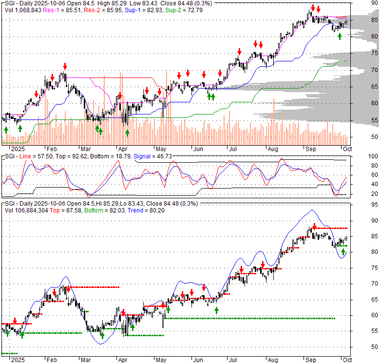 Price has closed above its short-term moving average. Short-term moving average is currently above mid-term; and above long-term moving average. From the relationship between price and moving averages: This stock is BULLISH in short-term; and BULLISH in mid-long term.[ SGI ] has closed below upper band by 40.0%. Bollinger Bands are 28.9% narrower than normal. The current width of the bands does not suggest anything about the future direction or movement of prices.