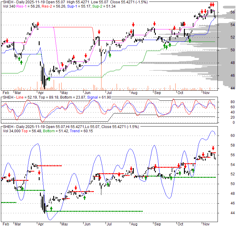 Price has closed below its short-term moving average. Short-term moving average is currently above mid-term; and above long-term moving average. From the relationship between price and moving averages: This stock is NEUTRAL in short-term; and BULLISH in mid-long term.[ SHEH ] has closed above bottom band by 34.0%. Bollinger Bands are 22.4% narrower than normal. The current width of the bands does not suggest anything about the future direction or movement of prices.