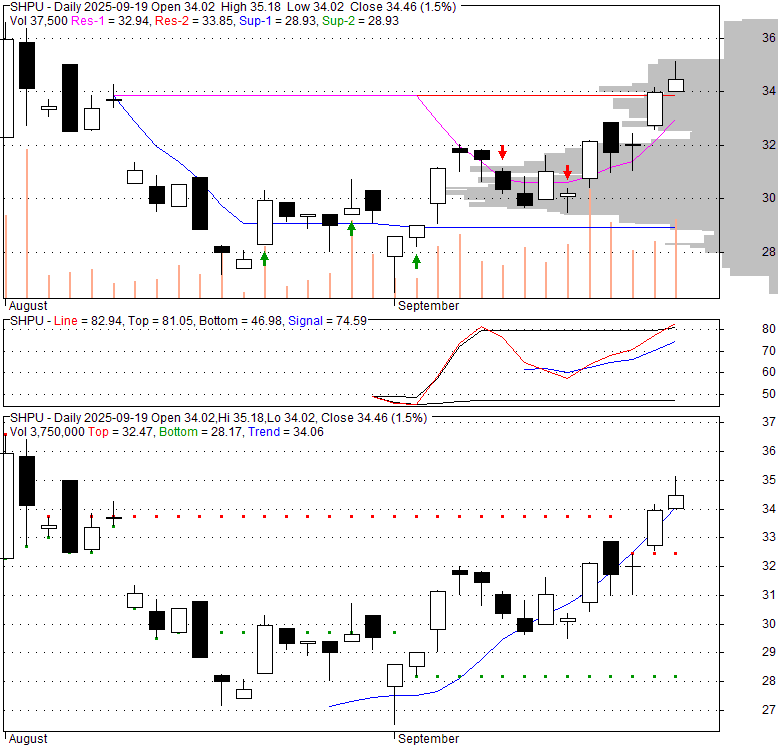 Price has closed above its short-term moving average. Short-term moving average is currently below mid-term; and below long-term moving average. From the relationship between price and moving averages: This stock is NEUTRAL in short-term; and NEUTRAL in mid-long term.[ SHPU ] has closed above the upper band by 3.7%. If price is in a uptrend band; this upward trend in price might continue. However a short term pullback inside the band is likely.Bollinger Bands are 0% narrower than normal.