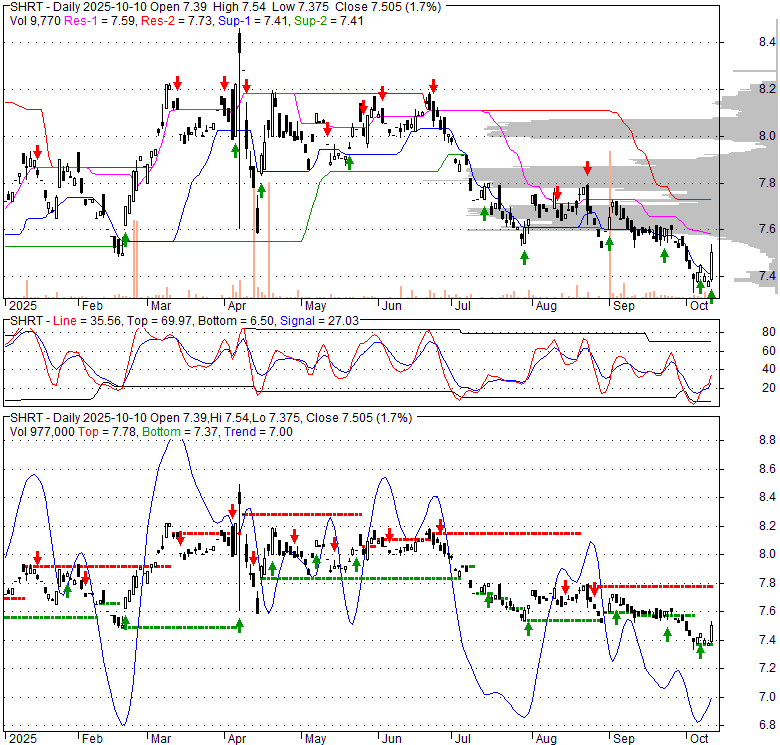 Price has closed above its short-term moving average. Short-term moving average is currently below mid-term; and below long-term moving average. From the relationship between price and moving averages: This stock is NEUTRAL in short-term; and BEARISH in mid-long term.[ SHRT ] has closed below upper band by 46.6%. Bollinger Bands are 23.9% wider than normal. The current width of the bands does not suggest anything about the future direction or movement of prices.