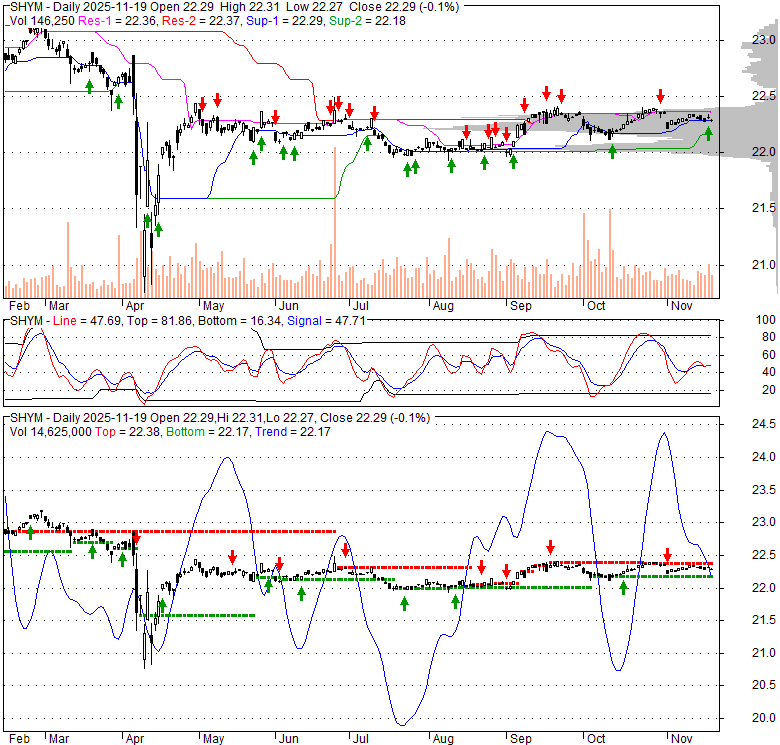 Price has closed below its short-term moving average. Short-term moving average is currently above mid-term; and above long-term moving average. From the relationship between price and moving averages: This stock is NEUTRAL in short-term; and BULLISH in mid-long term.[ SHYM ] has closed above bottom band by 40.8%. Bollinger Bands are 43.3% narrower than normal. The narrow width of the bands suggests low volatility as compared to its normal range. The bands have been in this narrow range for 0 bars. This is a sign that the market may be about to initiate a new trend.