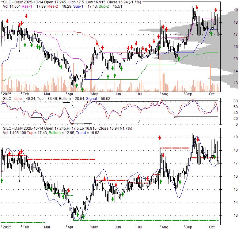 Price has closed below its short-term moving average. Short-term moving average is currently above mid-term; and above long-term moving average. From the relationship between price and moving averages: This stock is NEUTRAL in short-term; and BULLISH in mid-long term.[ SILC ] has closed above bottom band by 34.3%. Bollinger Bands are 35.1% narrower than normal. The current width of the bands does not suggest anything about the future direction or movement of prices.