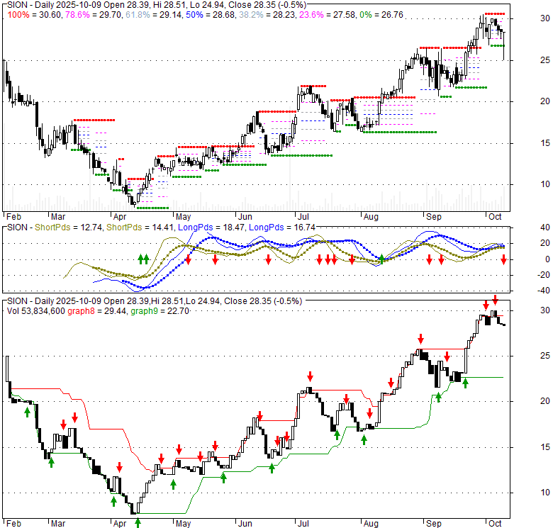 Price has closed below its short-term moving average. Short-term moving average is currently above mid-term; and above long-term moving average. From the relationship between price and moving averages: This stock is NEUTRAL in short-term; and BULLISH in mid-long term.[ SION ] has closed above bottom band by 38.2%. Bollinger Bands are 9.2% wider than normal. The current width of the bands does not suggest anything about the future direction or movement of prices.