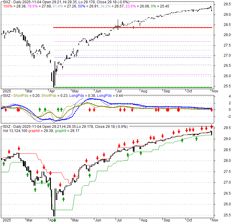 Price has closed below its short-term moving average. Short-term moving average is currently above mid-term; and above long-term moving average. From the relationship between price and moving averages: This stock is NEUTRAL in short-term; and BULLISH in mid-long term.[ SIXZ ] has closed below the lower bollinger band by 1.7%. If price is in a downtrend band; this downward trend might continue. However a short term pullback inside the band is likely. Bollinger Bands are 41.1% narrower than normal. The narrow width of the bands suggests low volatility as compared to its normal range. The bands have been in this narrow range for 80 bars. This is a sign that the market may be about to initiate a new trend.