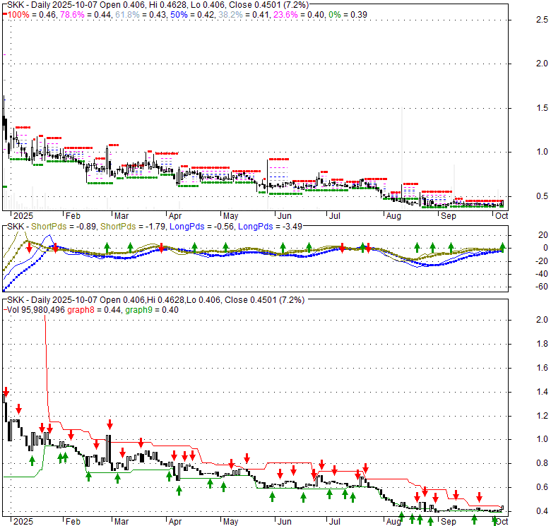 Price has closed above its short-term moving average. Short-term moving average is currently below mid-term; and below long-term moving average. From the relationship between price and moving averages: This stock is NEUTRAL in short-term; and BEARISH in mid-long term.[ SKK ] has closed above the upper band by 20.6%. If price is in a uptrend band; this upward trend in price might continue. However a short term pullback inside the band is likely.Bollinger Bands are 58.5% narrower than normal. The narrow width of the bands suggests low volatility as compared to its normal range. The bands have been in this narrow range for 16 bars. This is a sign that the market may be about to initiate a new trend.