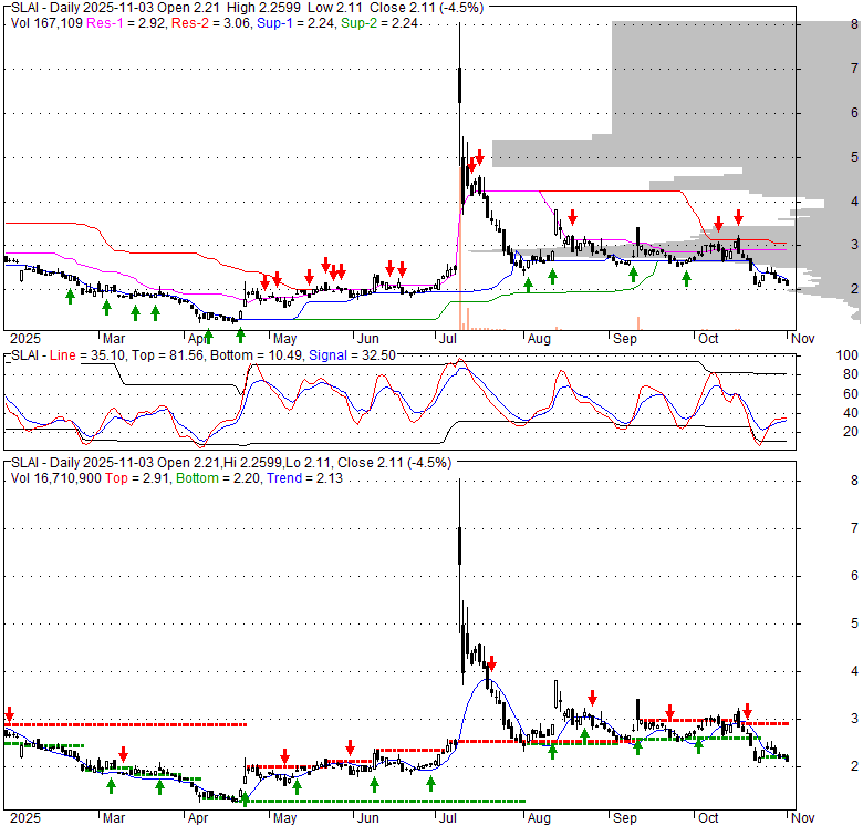 Price has closed below its short-term moving average. Short-term moving average is currently below mid-term; and below long-term moving average. From the relationship between price and moving averages: This stock is BEARISH in short-term; and BEARISH in mid-long term.[ SLAI ] has closed above bottom band by 11.9%. Bollinger Bands are 15.1% narrower than normal. The current width of the bands does not suggest anything about the future direction or movement of prices.