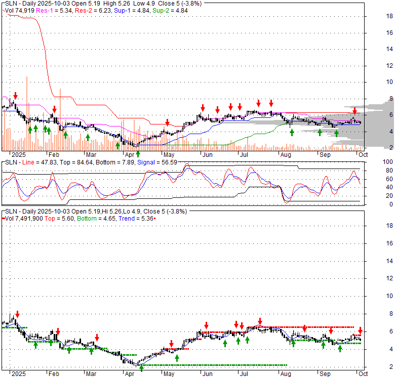 Price has closed below its short-term moving average. Short-term moving average is currently below mid-term; and below long-term moving average. From the relationship between price and moving averages: This stock is BEARISH in short-term; and BEARISH in mid-long term.[ SLN ] has closed above bottom band by 39.0%. Bollinger Bands are 25.2% narrower than normal. The current width of the bands does not suggest anything about the future direction or movement of prices.